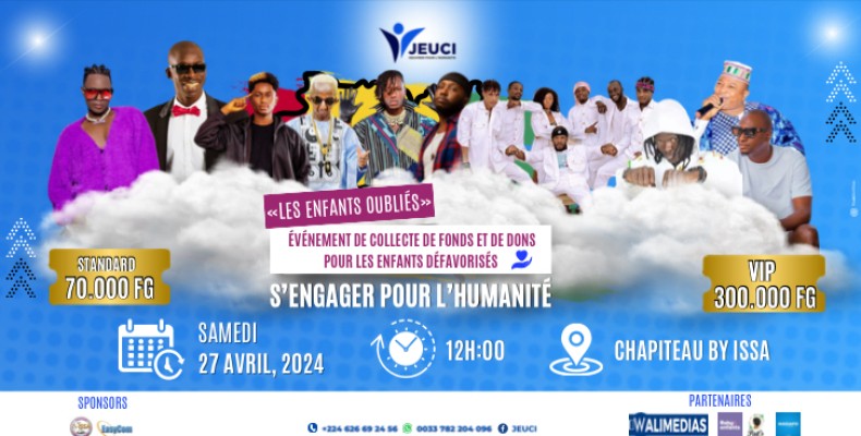 La JEUCI s’engage pour l’humanité. Une structure qui œuvre dans le but d’aider les enfants défavorisés. Cette collecte de fonds sera couronnée par un concert géant au chapiteau By Issa avec la présence de plusieurs grands noms de la musique Guinéenne