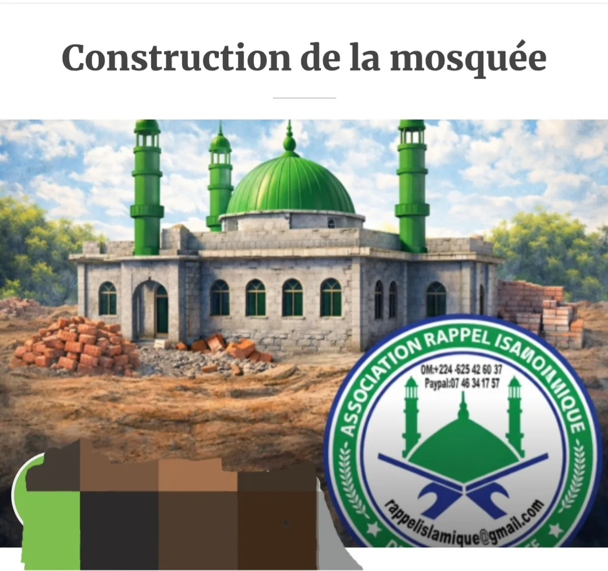 Chers frères et sœurs,La collecte pour la construction de la mosquée est toujours en cours et l’urgence est réelle.Le projet avance, mais il a encore ...