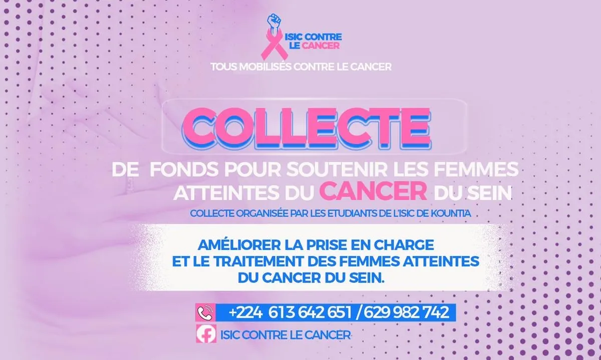 Dans le cadre de la lutte contre le cancer du sein, les étudiants de l’ISIC de Kountia, à travers l’initiative ISIC Contre le Cancer, lancent une collecte de fonds solidaire en faveur des femmes atteintes de cette maladie.
